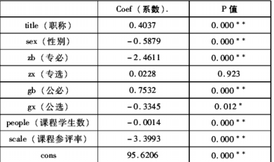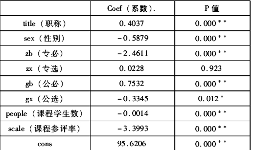 首先,对全部评教数据进行怀特检验,结果在1%置信水平下显著,由怀特检验结果可知评教数据存在显著异方差现象。因此,本文的实证模型采用加权最小二乘法(WLS)进行估计,并得到表3的结果。