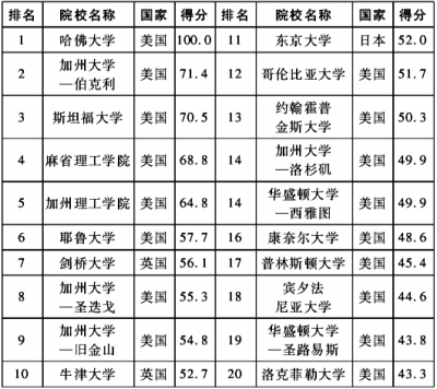 自2003年至2014年,全球共有627所学校先后进入ARWU排名,其中387所学校连续12年进入了500强榜单。由于涉及到同一指标不同学校间的跨年比较,在院校层面,我们仅对连续进榜的这387所学校计算平均分,得到N&S指标均分全球大学排名。限于篇幅,表1只列出指标均分全球前20名大学。经统计,第100名学校为21.1分,第200名学校为14.3分,第300名学校为9.9分。总体而言,发达国家的传统强校占据了指标均分排名前列:美国的哈佛大学摘得桂冠,加州大学各所分校位列前茅;英国的剑桥大学和牛津大学、日本的东京大学等校也有着卓越表现。