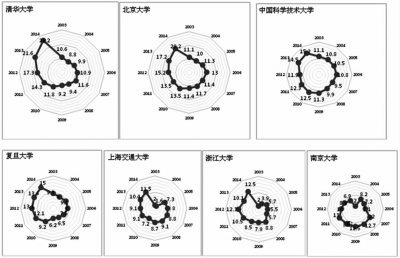 在这一榜单中,我国大学均处于全球200强以外,其中清华大学以13.5分位列第219位,北京大学以13.3分位列第223位,中国科学技术大学以11.7分位列第250位,香港大学以11.4分位列第263位。图1呈现了我国部分大学的N&S指标历年得分情况。可以看到,由于起步分较低,南京大学、浙江大学、上海交通大学等学校目前仍然未能突破20.0分大关,均分处于10.0分以下,没有进入排名前300位。复旦大学和中国科学技术大学虽然每年得分相对稳定,但分数增长速度较慢,上升空间有待拓展。综合来看,过去的十多年里,我国大学在这一指标上的表现与世界一流大学还有不小差距。
