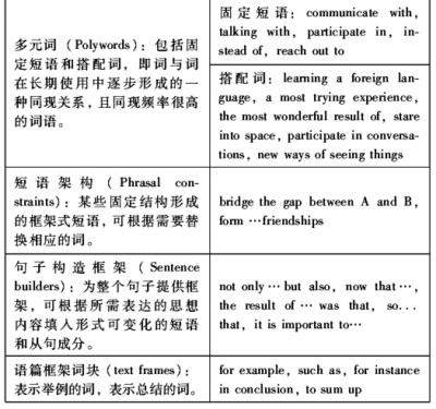 在词块的识别测试中,学生需列举出课文中出现的词块。结果发现,因为对词块不了解,学生不能进行词块分类,只是将他们所认为的词块罗列在一起。为明确学生所列举的词块类型,这里按照短语理念的词块分类方法,即多元词、短语架构、句子构造框架、语篇框架词块,将这些词块进行整理归纳,如表2所示。