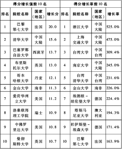 在全球387所连续进榜的大学中,有177所学校N&S指标得分呈现增长趋势,有204所学校得分有所下降。得分增长值和得分增长率前10名大学如表3所示。在这份榜单中,我国大陆地区的清华大学位居得分增长值排名次席,其得分增长高达15.6分,实现了飞速进步。而在得分增长率方面,浙江大学、上海交通大学、台湾大学、南京大学、台湾清华大学等两岸高校同样表现抢眼,增长幅度均超过200%,一举包揽了增长率前5名。由此可见,在过去的十多年里,我国大学在顶尖科研产出方面取得了快速发展。除我国外,同为金砖国家的南非也有一所学校———金山大学进入了榜单前10名。该校近年来在顶尖科研产出方面的表现值得关注。