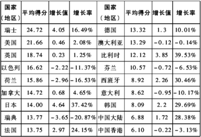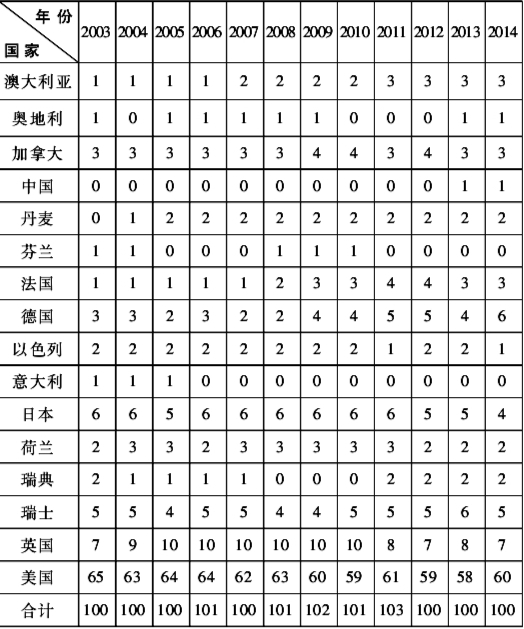 在ARWU排名中,有18个国家(地区)每年至少有5所大学进入了500强榜单。我们针对这18个国家(地区)测算大学均分表现,并按照年度进行得分汇总,得到国家(地区)N&S指标得分数据。表4揭示了2003年到2014年期间N&S指标国家(地区)得分增长情况。
