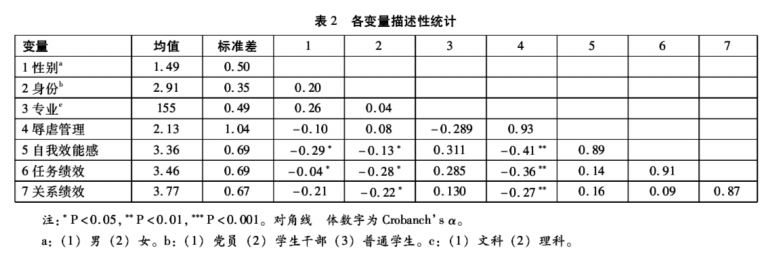 研究采用回归分析,检验假设结果,详见表3。在自变量辱虐管理和因变量任务绩效、关系绩效相关分析基础之上,建立简单线性回归方程,研究发现辱虐管理对任务绩效(R2=0.06,F=2.69,P<0.001)和关系绩效(R2=0.08,F=3.95,P<0.01)均有显著负向影响。研究发现,在控制了性别、身份和学科变量后,辱虐管理对任务绩效(R2=0.12,F=1.37,P<0.001)和关系绩效(R2=0.157,F=1.97,P<0.01)仍然有显著负向影响。因此,上述研究证明假设1和假设2成立。