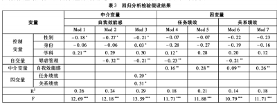 研究采用层级回归法,检验自我效能感在辱虐管理和学习绩效之间的中介效应。Kenny等人提出中介效应检验的三个条件:一是自变量辱虐管理对因变量任务绩效和关系绩效有显著影响(已满足);二是自变量辱虐管理对中介变量自我效能感有显著影响;三是将自变量辱虐管理和中介变量自我效能感带入回归方程时,自我效能感的中介效应显著,而辱虐管理自变量效应减少或消失。 由Mod2可知,辱虐管理对自我效能感(R2=0.29,F=13.59,P<0.001)有显著负向影响,满足了自我效能感中介效应的第二个条件。由Mod5和Mod7可知,自我效能感与任务绩效(R2=0.21,F=11.88,P<0.001)和关系绩效(R2=0.18,F=11.71,P<0.001)之间存在显著正向影响。由Mod3可知,将辱虐管理、自我效能感带入回归方程模型时,自变量辱虐管理与因变量任务绩效和关系绩效负向影响(R2=0.24,F=12.18,P<0.001)仍然保持显著,但显著性水平明显减弱。由此可以说明,自我效能感在辱虐管理与任务绩效和关系绩效关系中存在中介效应,假设3和假设4得到了支持。因此,辱虐管理和自我效能感作为自变量比辱虐管理单独自变量能更好地影响任务绩效和关系绩效,充分表明了自我效能感在辱虐管理与任务绩效和关系绩效之间起到了中介效应。