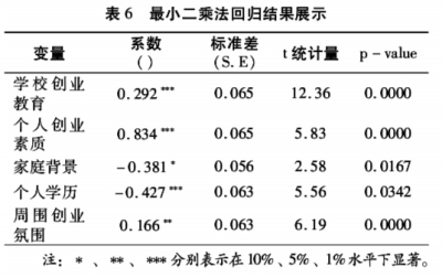 (2)个人创业素质在1%以内显著,与大学生创业意愿显著正相关,并且通过系数可以判断个人创业素质是影响学生创业意愿的最主要因素。