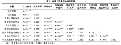 以政府为主导的外部动力因素传导机制中,政府支持引导力与企业经济利益需求显著强相关,法律法规约束力与企业价值认同和追求显著强相关,两者相关系数均在0.6以上。这与吴强(2015)的研究结果基本一致,政府的介入包括法律法规、制度、政策等一定政治资源支持,资本支持有利于增强企业参与校企合作的意愿。 以高校为主导的传导机制中,高校资源能力吸引力分别与企业内部动因人力资本、科技资源需求显著强相关,相关系数分别为0.730和0.665。以宏观环境为主导的传导机制中,非正式规范约束力与企业价值认同和追求显著强相关,相关系数为0.697;市场状况拉动力与企业经济利益需求显著强相关,相关系数为0.711;社会科技发展水平拉动力与企业科技资源需求显著强相关,相关系数为0.642。
