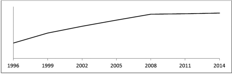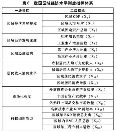 区域经济水平不单指一个区域的GDP水平,它是一个区域在一定时期内经济规模、经济结构、市场化程度等诸多经济指标的体现,因此它是一个综合的、系统的概念。区域教育政策支持力度,是指一个区域在一定时期内为促进教育的发展而采取的种种措施,也是一个综合、系统的概念。因此,要研究区域经济水平和区域教育政策支持力度对高等教育核心竞争力发展与演变的影响,选取一些具有代表性的指标是十分必要的。本文以我国的31个省域为样本,从区域经济发展规模、经济发展速度、经济结构、收入与消费水平、市场化程度、科技创新能力六个维度选取了18个具有代表性的区域经济水平指标,从重点高校建设情况、社会办学力度、高等教育经费投入力度、高校科研支持力度、高等教育政策绩效五个维度选取了16个区域教育政策支持力度指标,并分别对我国1996年、1999年、2002年、2005年、2008年、2011年、2014年7个时间节点上的区域经济水平和区域高等教育政策支持力度进行定量测度研究,具体测度指标见下表6、表7。