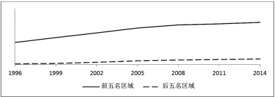 为观察我国高等教育核心竞争力在区域差异上的演变,本文将我国“两极区域”的高等教育核心竞争力进行历时性比较。取以上7个时间节点排名前五和后五的“两极区域”,并分别对每年“两级区域”高等教育核心竞争力水平进行比较,其差距趋势如图2所示。