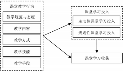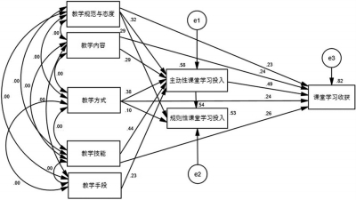 根据赵春鱼(2014)的研究,教师教学质量一方面直接影响学习绩效,另一方面通过学习投入中介作用间接影响学习绩效。本文假定课堂教学行为的不同维度不仅直接影响课堂学习收获,而且分别通过主动性课堂学习投入和规则性课堂学习投入间接影响课堂学习收获,如图1所示。通过样本数据来检验课堂教学行为、学习投入、学习收获之间的影响路径,并探索找出提升学生课堂学习投入和学习收获的关键指标。