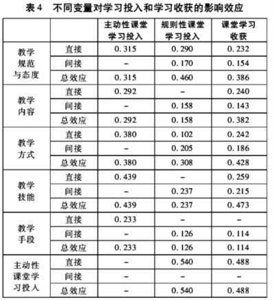 根据研究路径框架,构建从教学行为5个维度到课堂学习投入2个维度,再到课堂学习收获的饱和模型,通过AMOS软件进行路径分析,发现教学内容、教学技能、教学手段到规则性学习投入的路径系数不显著,教学手段和规则性学习投入到学习收获的路径系数不显著,说明这些假定路径没有通过检验。删除上述回归系数不显著的路径,最终形成如图2的路径模型。该模型的适配度检验卡方值在自由度等于5时为4.170,显著性概率值p=0.525>0.05,未达到显著水平,接受虚无假设,表示该模型与样本数据间可以适配。再从其他适配度指标来看,卡方与自由度的比值为0.834<2.000,RMSEA值=0.000<0.050,GFI值=0.997、AGFI值=0.976、NFI值=0.996、RFI值=0.977、IFI值=1.001、TLI值=1.005、CFI值=1.001,都大于0.900,说明该模型与样本数据适配良好。 教学行为对课堂学习投入和课堂学习收获的影响效应值见表4。