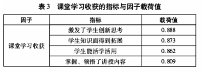 3.课堂学习收获的测量。借鉴学术性收获的定义,包括学生对专业知识、专业技能等的习得和掌握,引入课堂学习收获变量,选取4个指标衡量课堂学习收获的大小,包括掌握、领悟了讲授内容、学生能活学活用、学生知识面得到拓展、激发了学生创新思考。对这4个指标进行因子分析,按照特征值大于1的标准正好提取1个因子,解释73.695%的变异,各指标的因子载荷见表3。