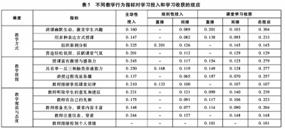 (二)影响课堂学习收获的关键教学行为指标由图2可知,教学行为的五个维度对课堂学习收获都有直接或间接的影响,每个维度下的指标是如何影响课堂学习收获的,哪些指标起到关键作用?本文分别检验每个维度下教学行为指标对课堂学习投入和课堂学习收获的影响路径。首先构建从教学行为指标到学习投入和学习收获的饱和模型,然后逐步删除回归系数不显著的路径,最后得到如图3所示(以教学方式维度为例)的不同维度的教学行为指标对学习投入和学习收获的影响路径。每个维度下的指标对学习投入和学习收获的效应值见表5。
