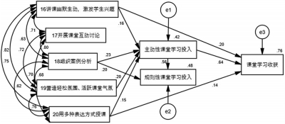 从图2和表4可以得到以下分析结果:(1)主动性课堂学习投入在教学行为与课堂学习收获之间具有中介作用,其中在教学手段与课堂学习收获的关系中起到完全中介作用,在教学内容、教学方式、教学技能、教学规范与态度和课堂学习收获的关系中起到部分中介作用。(2)在课堂学习投入的2个维度中,主动性学习投入在教学行为各维度与规则性学习投入之间具有中介作用,其中在教学规范与态度、教学方式与规则性学习投入之间具有部分中介作用,在教学技能、教学方式、教学内容与规则性学习投入之间具有完全中介作用。规则性学习投入对于课堂学习收获没有显著影响。由此可见,主动性课堂学习投入在课堂教学中至关重要。(3)在教学行为5个维度对主动性课堂学习投入的影响中,教学技能的作用最大(0.439),其次是教学方式和教学规范与态度,然后是教学内容和教学手段;在对规则性课堂学习投入的影响中,教学规范与态度的作用最大(0.460),其次是教学方式(0.308),然后是教学技能、教学内容和教学手段;在对课堂学习收获的影响中,教学技能(0.473)和教学方式(0.428)的作用较大,其次是教学规范与态度(0.386)和教学内容(0.382),教学手段的作用最小。