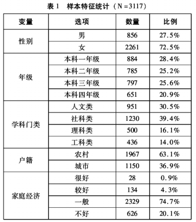 调查问卷内容分为两个部分:第一部分是样本量的统计特征,包括性别、学科门类、户籍、家庭经济状况等指标;第二部分是问卷调查的主体,是测量大学生学习满意度、学生自我学习效能各影响因素的评价指标。问卷采用李克特(Likert)五级量表的方式,对所有变量从低到高进行赋值,其中1为非常不同意,2为比较不同意,3为一般,4为比较同意,5为非常同意,数值的大小表明学生对在校学习各项满意度指标评价的高低状况。