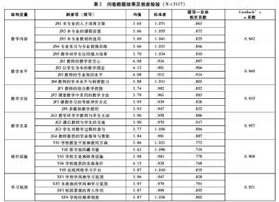 量表编制基于本研究设定的假设模型,同时参考了国内外各方研究文献,并充分借鉴已有满意度问卷,在此基础上结合地方本科高校办学特征,征集相关教学管理人员和专家意见,形成本次地方本科高校学生学习满意度调查问卷。由于本研究中结构变量属于潜变量无法直接测得,因此所有结构变量均使用4-5个测度题项,经过反复试测和修订使其能够准确反映大学生学习活动特点和满意度评价要求,具体测度题项内容和各指标得分见表2。
