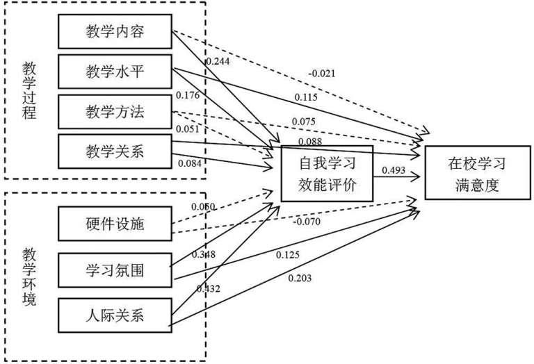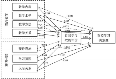 第一,本次调查数据显示,教学内容对学生学习满意度没有产生直接影响,教学方法对学生自我学习效能和学习满意度均未产生显著影响。按照教学论和学习理论观点来看,这一结论似乎有所矛盾和冲突。但这里可能存在两个方面的解释,一是所调查地方本科高校的教学内容存在不合理之处,教学方法仍然较为滞后,没有对学生学习满意度产生正向积极影响。从本次调查教学内容指标的平均得分来看,教学内容和教学方法平均得分较低,其中教学内容满意度在所有指标中均值最低(约3.67左右)。这也表明学校教学内容和教学方法可能没有很好地适应大学生学习需求,导致学生对教学内容和教学方法不够满意。因此学校在教学内容的设置上亟待大力改进,需进一步重点抓好课程建设和教材建设,合理制定人才培养方案,增强教学内容对学生学习需求的适应能力。二是大学阶段的学习方式与基础教育存在很大不同,学生自主性学习成为学习主体,学生对课堂教学内容的依赖程度有所降低,因此表现出教学方法对学生自主学习效能作用路径不显著,反而是教学关系、学习氛围等因素对自我学习效能产生直接影响。这就要求学校进一步提高学生学习自主性,为学生创设融洽的学习氛围和教学关系,不断帮助学生成为学习主体,增加学习动机和自我效能感。