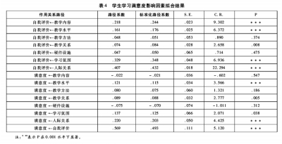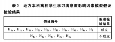 根据路径分析结果我们可以看出,除了教学内容对学习满意度、教学方法对自我学习效能和学习满意度、硬件设施对自我学习效能和学习满意度没有产生显著的路径影响,其他各项路径作用关系均在P<0.05水平以下显著。标准化路径系数大小反映出各要素之间影响作用的强度大小,其中学生自我学习效能评价对学习满意度的影响最为显著,具体路径关系作用结果和假设检验结果见图2和表5。