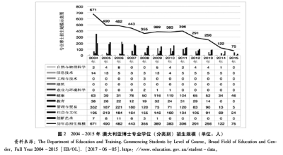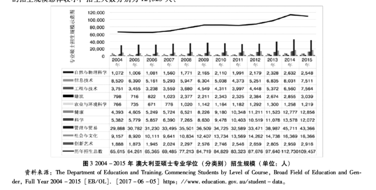 从课程型(专业)硕士研究生招生类别的历年统计数据来看,2004年至2015年,课程型硕士在农业与环境科学、自然与物理科学以及建筑等类别的招生规模总体较小,招生人数分别为12,525人、22,443人以及23,567人;管理与贸易类别的招生规模最大,达到426,254人;其次是社会与文化类别,其招生规模总数为150,108人(如图3所示)。