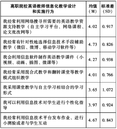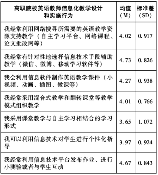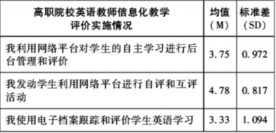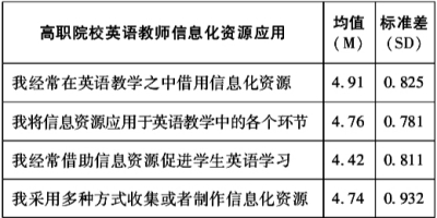 高职院校英语教师信息化能力调查了信息资源应用、信息化教学设计和实施行为、信息化教学评价实施三个方面。整体而言,信息化资源应用调查结果理想,信息化教学设计和实施行为表现一般,信息化教学评价实施更次之。