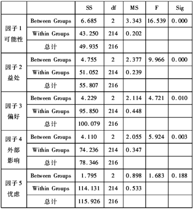 在本次参与问卷的217名高校教师中,男教师有97人,女教师有120人。本文采用方差分析法来探究不同性别的高校教师的移动学习准备状态是否