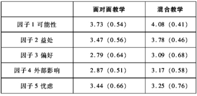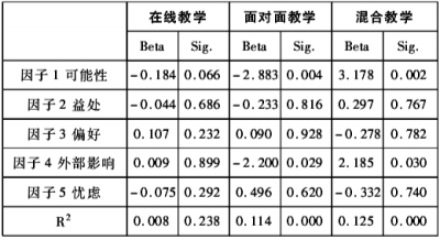 综上所述,当前几乎没有高校教师倾向于在线教学的教学方式,大部分教师更倾向于混合教学的教学方式,并且相比于面对面教学倾向的教师,他们认为未来移动学习融入教学有更大的可能性,对应用移动技术教学带来的益处有更强烈的感知,而且对使用移动技术或设备的偏好程度更高。此外,他们认为学校对移动学习的支持度相对更高,因此倾向于混合教学的高校教师有着更好的移动学习准备状态。另外,通过回归分析可以发现,移动学习融入教学的可能性和外部影响与高校教师对未来教学方式的倾向程度(除在线教学外)存在显著的线性相关关系,所以高校教师对未来教学方式的倾向与高校的移动学习准备情况有着显著的相关关系,H2假设成立。