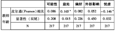 本文通过Pearson相关分析来探究教师年龄与移动学习准备的相关性,结果见表8。由表8可见,高校教师年龄与因子2益处呈显著正相关的关系(α=0.082,p=0.015<0.05),这说明更高年龄的教师对移动学习融入教学的益处感知更为强烈;从另一方面,高校教师年龄与因子5忧虑呈显著的负向影响关系(α=-0.146,p=0.032<0.05),表明高年龄的教师对移动学习负面影响的忧虑感更低。另外,本文通过相关分析发现高校教师的年龄与其技术整合水平呈显著的正相关关系(α=0.142>0,p=0.037<0.05),说明年龄更高的高校教师的技术整合水平更高。