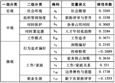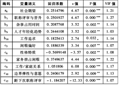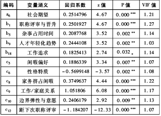 构建多变量响应回归方程,各变量的方差膨胀因子取值明显小于10,且均值1.80小于5.00,说明各自变量间相关度较低,多重共线性问题对于回归结果的影响较小。由多响应回归分析结果可知,有效观察变量N=667,R2=0.2658,LR chi2(38)=352.06,P=0.0000<0.0001,说明以高校教师过劳程度为因变量的回归方程具有统计学意义。在所有自变量中,宏观层面的变量a6社会期望、中观层面的变量b1职称评审与晋升、b5杂事占用时间、b9人才年轻化趋势、b18工作追求和微观层面的变量c5闲暇偏好、c6性格特质、c8家务挤占闲暇、c9工作/家庭关系、c10边界弹性与意愿、c12距下次职称评审这11个变量的参数估计值的z值统计量较大且对应的概率值P较小(P<0.05),说明这11个变量至少在P=0.05的水平上具有统计学意义,而其他的变量z值统计量较小且对应的概率值P较大,说明不具有统计学意义。由此可以说明,全自变量回归分析中只有11个变量对于高校教师过劳程度的影响作用显著(由于篇幅限制,全自变量多响应回归方程分析结果在此不作展示)。