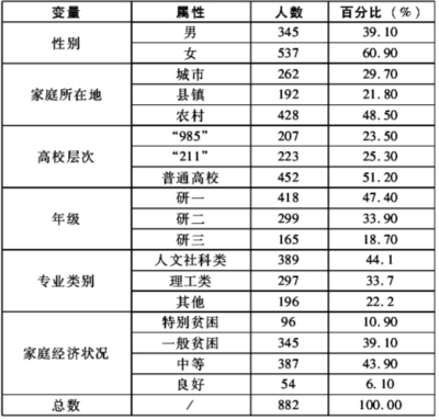本研究以全日制学术型硕士研究生为研究对象,采取网络和纸质问卷两种形式,共发放问卷1000份,回收问卷936份,回收率为93.6%。问卷回收后,经逐份浏览和排查,将题目空缺及答题一致的视为无效问卷,去除无效问卷54份,有效问卷为882份,有效率为94.23%。调查对象涉及我国25个省区直辖市,覆盖来自我国东西南北中不同地区、不同层次、不同类型高校的882名硕士研究生,样本分布基本情况见表1。