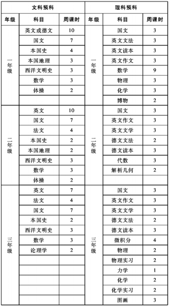 由表2可见,这一阶段的预科课程涉及的内容十分广泛,具有通识教育的性质。这一阶段的通识教育课程(预科课程)具有以下特点:第一,文、理预科共同科目仅有国文、外语、数学三门。第二,重视语言学科,尤其重视外语。无论文、理预科,三年中都有国文课程。文预科除了对英语有大量的课时要求之外,还另外要求修习德文和法文,相当于有三门外语的要求。理预科主要是英文和德文,其中分类较细,英语分为文法、读本、作文和文学四种不同课型,德文分为文法和读本两种课型。第三,重视数学课程的学习。文、理预科都比较重视数学课程的学习,理预科尤甚。第四,重视服务专业教育的基础课程的学习,这一点从预科课程表可以看出来。文预科课程侧重历史、地理、论理(逻
