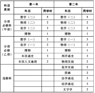 纵观这一阶段的预科通识教育体系,不难发现以下特征:第一,重视语言学科课程的学习。除了对国文的要求外,还要求学生掌握两种外语。第二,重视数学、博物课程的学习。无论甲、乙两部,两年时间都需要修习这两门课程。第三,重视自然科学课程的学习。所开设课程中人文社科类课程较少。总体而言,这一阶段的预科课程兼顾了人文、社会、自然科学方面的知识,但略偏重自然科学课程和语言学方面等课程。