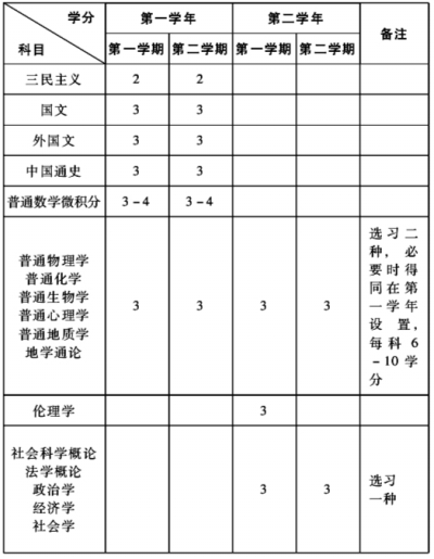 综上所述,这一时期的大学课程变革具有以下特点:其一,统一了大学课程设置标准,结束了大学课程自由散乱的局面。其二,大学通识教育主要依托共同必修科目来实现。其中,所有学生都必须修习的科目包括:国文、外国文、党义、伦理、体育。另外文、理、法、师范学院还需要修习中国通史、世界通史、理则学、哲学概论、自然科学之一门、社会科学之一门等课程。农、共、商学院偏于应用,但大体都会要求学习数学、经济学等科目。其三,各界基本达成共识,大学一二年级应重在学生共同基础的养成,施行通识教育,三四年级方使学生专于某一专门领域。