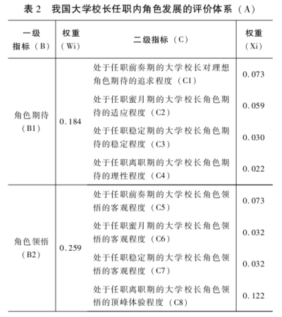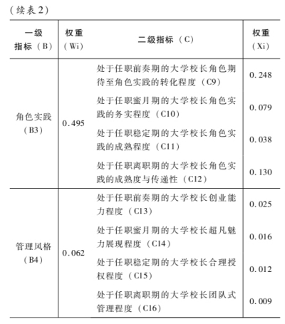 度”;(3)处于离职期的大学校长角色实践由“保守”修正为“角色实践的成熟度与传递性”;(4)处于离职期的大学校长管理风格去除“抨击行政机构”。最终建立大学校长任职内角色发展的评价体系,确定4个一级指标、16个二级指标。