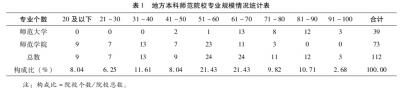 为了明晰地方本科师范院校专业设置的真实情况,本研究以112所地方本科师范院校①为样本对象开展研究。在测量变量上,主要从专业规模、专业结构、师范专业所占比重、红牌专业设置四个方面开展,样本数据主要以样本院校《2019年本科教学质量报告》为基础数据,辅以各样本院校官方网站专业设置情况(数据截至2019年12月),并对有疑问、不清晰之处通过电话咨询、资料查询等进一步核实,以实现数据之间的三角互证。本研究选取有效样本112所,为地方本科师范院校全部样本,占样本总量的100%,能完全反映样本的真实情况。