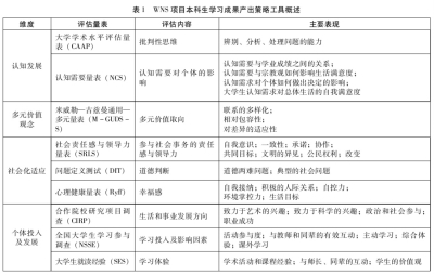 长期以来,WNS一直致力于收集高质量的本科生博雅教育数据,相比NSSE测量范围小而精,其不仅关注本科生认知方面的学习成果产出,还注重对非认知方面的学习成果产出进行测评。WNS是基于研究驱动的大学生学情调查项目,在研究设计、测量工具等多个方面充分体现了项目的科学性、多元性以及博雅教育的人才培养目标,为我国实施大学生学情调查提供了调查目的、研究思路以及测量内容等多方面的启示。