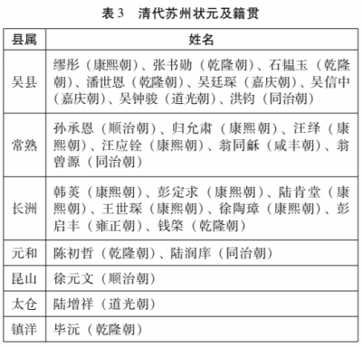 江苏的科举名城中尤以苏州为最。张大纯在《吴中风俗志》中说:“吴俗之称于天下者三:曰赋税甲天下也,科第冠海内也,服食器用兼四方之珍奇,而极一时之华侈也。”[17]以致于世间有如此评价:“不识大魁为天下公器,竟视巍科乃我家故物。”[18]苏州人汪琬在《觚塍》中将苏州状元称为“土产”。所谓“东南人士,姑苏最盛”[19],客观而论,这些评价毫不过誉。明代,苏州考中状元7人,榜眼16人,探花20人。⑦清代,苏州府不但一府科举名次为全国之冠,且豪取全国四分之一的状元名额。(见表3)其县属长洲人氏钱棨更是“连中三元”(解元、会元、状元)。正如康熙末年江苏布政使杨朝麟所评:“本朝科第,莫盛于江左,而平江一路,尤为鼎甲萃薮,冠裳文物,竞丽增华,海内称最。”[20]