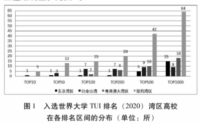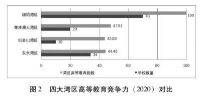 所大学入选世界大学第三方指数(2020)评价报告,其中134所大学位于四大湾区内,占总数的9.13%,四大湾区共拥有世界TOP10大学6所,世界TOP50大学17所,世界TOP100大学25所,世界TOP500大学66所,展现出四大湾区在全球的强劲的高等教育竞争力,详见图1。《全球四大湾区高等教育第三方指数竞争力评价报告(2020)》[7]结果显示,粤港澳大湾区高等教育竞争力排在第二位,高等教育第三方指数得分47.97分,评价学校数量排在第三位,共20所,进入TOP100的大学共2所,一流大学的数量和世界排名与纽约湾区、旧金山湾区差距明显。见图2。
