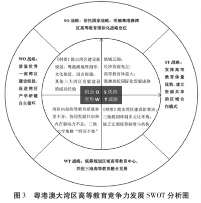 基于粤港澳大湾区高等教育基础数据、世界大学排名和四大湾区高等教育竞争力指数,运用SWOT分析法构造SWOT分析图。如图3。