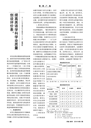 评价是英语课程的重要组成部分,而科学的评价体系则是实现课程目标的重要保障。《广州市小学英语学科学业质量评价标准》分别对一、二年级的口语、三至六年级的英语学习制定了评价的内容和标准,各项评价的指标都是指导教师教学的很好依据。它的一个重要理念,就是在关注量化的纸笔测试的同时,还关注各种非纸笔测试,如:项目测试、情景测试、项目评价、观察等,其中许多都与学生的学科思维方式和方法有关,这就决定了教师必须研究本学科的思维方式和方法,以正确评价学生的学业质量。教师可以根据《学科学业质量评价标准》里学习到的评价理论和体会结合实际,实践于平时的英语教学活动中,给学生设计相应的评价表,把形成性评价与终结性评价结合起来,有效提高学生的学习质量和教师的教学质量。