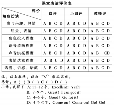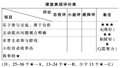 英语新课标对英语课程的任务是这样描述的:“激发和培养学生学习英语的兴趣,使学生树立自信心,养成良好的学习习惯和形成有效的学习策略,发展学生自主学习的能力和合作精神……”为了让学生注重自我评价与学生间互相评价相结合,通过评价表这个媒体,让学生在课堂不但能够学到知识,而且还可以培养创新精神和合作精神。教师可以在课前给学生分发课堂表现评价表,这样能够给予学生一个明确的课堂表现目标并能让他们更好的参与到课堂中去,在课后让学生根据自己该节课的表现马上做出自我评价,然后由四人小组长组织学生间互相评价,接着交给教师评价后返还给学生自己总结这节课拿了几颗星。教师可以根据每节课不同的特点,对具体项目的内容作出相应的调整。通过自我评价和小组评价,使学生对自己在这堂课的学习表现有所认识,进而改善不足,提高各方面的学习能力。