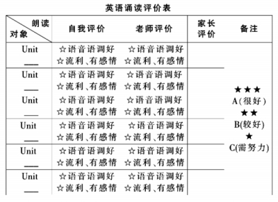 本表可根据年级的实际情况,有所侧重,高年级书面作业较多,听录音一项可不必每天都有,低年级可侧重于听录音和口头表达以提高学生的语音、语调水平。每一项做得好的就评一个★,不够好的就不能评★,总体评价能拿到九个★的同学,老师全班表扬,只拿到三个★的同学,老师要对该生情况进一步了解,促进其学习,一个星期连续拿到九个★的同学,给予适当的礼品进行表扬。