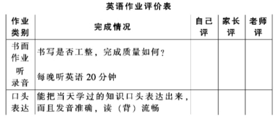 英语学习有四要素,它包括“听”“说”“读”“写”,而学生家庭作业设计也应该尽量包括这四要素。因此,设计英语作业评价表既可以提醒教师在布置作业时,不能只考虑布置笔头作业,也要布置听说类的作业,这样才能全面提高学生的英语水平。而且本评价表包含自评、家长评,能让学生和家长对作业做出量化的评价,让家长参与孩子的学习,根据孩子作业完成情况及时监督其学习。