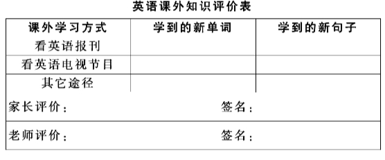 本表格可以结合学生的实际情况灵活运用,好的学生鼓励他们多阅读课外英语读物、观看英语电视节目或上网获取新单词、新句子,成绩不理想的学生不一定强求其所写的内容来自书本之外,可让他们记下一些自己认为难记的单词、难理解的句子。