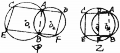 (1)CE,DF分居公共弦AB两侧(图甲),连结AB,则∠ABF=∠C,∵四边形ABFD内接于⊙O2,∴∠ABF+∠D=180°,∴CE∥DF,又CD∥EF,∴四边形CEFD是平行四边形。故CD=EF,CE=DF。