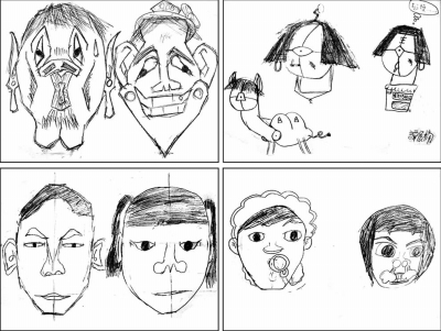 这个作业是要求学生用夸张的办法画出两个真实同学的肖像。视觉图式丰富的学生与视觉图式贫乏的学生在作品表现上呈现出不同的能力。