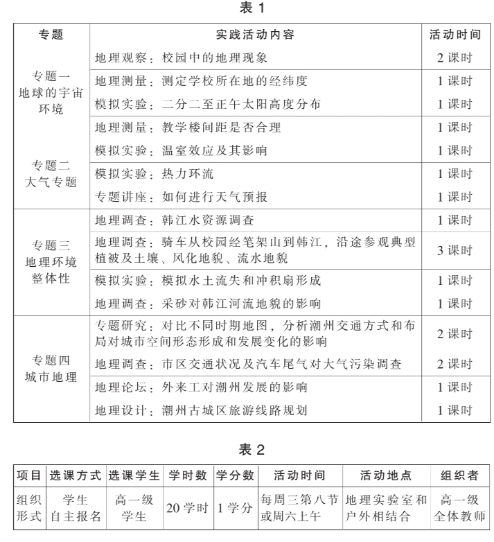 地理校本资源的开发对地理教学方式的转变,对地理课程目标的全面达成,以及促进学生的全面发展具有十分重要的意义。高中地理校本课程可挖掘的资源十分丰富,这为实践型校本课程的实施奠定了坚实的基础。通过开发,我校形成了一系列的专题实践型教学资源,并编写了《地理校本课程实践手册》。以某一学期为例,开设的课程内容见表1。