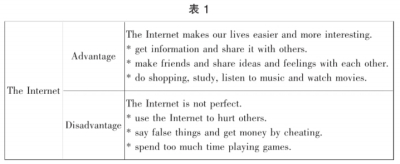 词块教学既不能仅停留在对词块意义和用法的解释和辨析上,也不应让学生仅停留在对单个词块的记忆上,而应采用“词块—句子—文章”的教学模式,让学生将词块运用到句子和语篇中,做到词不离句,句不离文。教学八年级上册Unit 4 Topic 3 “The Internet makes the world smaller” Section D时,教师可引导学生结合词块(如表1)复述课文,背诵范文,拓展总结,引导学生把学到的词块知识融入自己原有的知识当中,成为自己认知结构的有机组成部分,巩固和内化词块知识。这样学生提高了英语综合运用能力,并能轻松写出有关“The Internet”的英语作文。