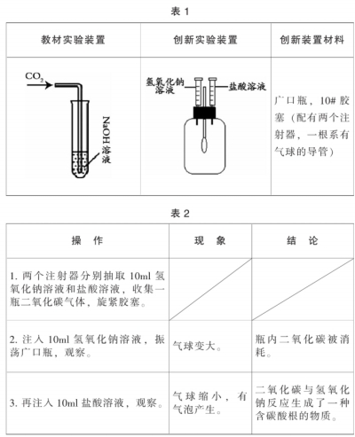 在教学“碱的化学性质”一节时,二氧化碳与氢氧化钠溶液的反应由于实验现象不明显,使学生在学习这一反应时没有感性认识,掌握较难。因此许多老师利用二氧化碳是气体,而生成物中没有气体,故借助压强的变化来判断反应的发生,设计出多套装置。但由于二氧化碳除了能与氢氧化钠反应外还能