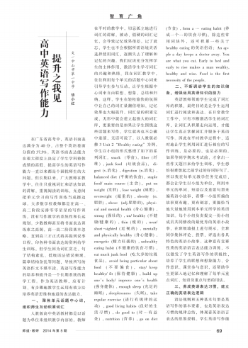 人教版高中英语教材都是以话题为单位来组织教学内容的。教师在平时的教学中,切忌孤立地进行词汇的讲解。被动、僵硬的词汇记忆,会导致记忆效果很差,记了就忘,学生也不会根据所需语境灵活选择使用词汇,逐渐失去了理解和记忆的兴趣。我们应该充分发挥学生的主体作用,激活学生学习词汇的兴趣和热情。我在词汇教学中,往往利用每个单元的话题中心词来引导学生参与互动,让学生根据中心词来自由联想、想象、总结和归纳。这样,学生在轻松愉快的氛围中让自己的词汇量翻倍增加,记忆效果也大幅提升。词汇量的积累完成,无形中就会建立起强大的词汇库,更重要的是如果让学生围绕这些话题来写作,学生就再也不会囊中羞涩,无话可说了。以人教版必修3 Unit 2“Healthy eating”为例,学生以小组的形式整理了如下的系列词汇。snack (零食),fiber(纤维), junk food (垃圾食品), digest(v.消化), digestion(n.消化), balanced diet(平衡的饮食),staple food/ main course(主食),put on weight(发胖), lose weight(减肥), overweight (超重的), obesity (n.肥胖), obese (adj.肥胖的),physical and mental health(身心健康), strong(强壮的), un/ healthy(不健康/健康的), thin(瘦的), near/ short-sighted(近视的), mentally and physically healthy(身心健康), energetic(精力旺盛的), unhealthy eating habit(不健康的饮食习惯), eat much junk food (吃太多的垃圾食品),avoid being particular about food (不要偏食),stay/ keep healthy/ fit(保持健康), build up one’s body/ improve one’s health(强身健体), enough sleep(充足的睡眠), sleeplessness (失眠),take regular exercise(进行有规律的运动) , good living habits(良好的生活习惯), do good to(对…有益处), nutrition(营养), go on diet(节食), form a … eating habit(养成一个…的饮食习惯)。除这些常用词块外,还可积累一些关于healthy eating的英语俗语:An apple a day keeps a doctor away. You are what you eat. Early to bed and early to rise makes a man wealthy, healthy and wise. Food is the first necessity of the people.