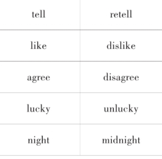 当教学中拓展单词时,利用构词规律进行词汇教学。比如看看下表的单词加了前缀后意思已经改变,单词开花,让学生记住更多的单词。