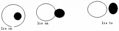 英语中有些词汇词义接近,但用法有所不同,很容易混淆。但如果用简笔画教学就显得非常简单。如表示方位的lie in, lie on, lie to等词组时,如何准确地使用它们可以用下面的图例表示: